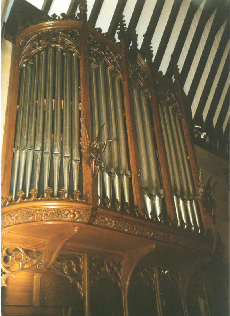 The organ was rebuilt in 2002 with mechanical action by Principal Pipe Organs of York (Geoffrey Coffin). The Consultant was Ian Bell who also designed the case. The instrument has 21 speaking stops and 1,312 pipes ranging in length from 16 feet to 1/2 inch. It uses all the pipework from the original 1885 organ built by Franklin Lloyd of Liverpool, with several hundred new pipes added. It is an effective accompanimental instrument (including frisky hymn tunes) and is versatile in coping with the organ repertoire. The Inaugural Recital was given by Professor Ian Tracey, Organist Titulaire of Liverpool Cathedral.